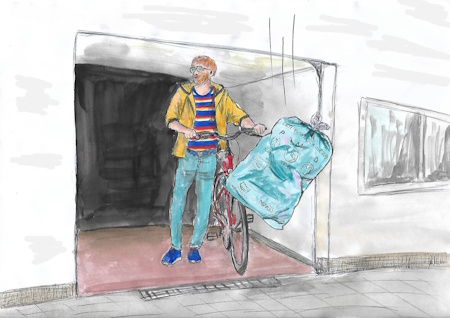 Terwijl de poort traag omhoog schoof en ik langzaam ontwaakte uit mijn verliefde bespiegelingen, werd ik plots met een harde klap ontnuchterd. Pal voor mij viel er een blauwe vuilzak naar beneden, een doffe plof op luttele centimeters van mij. Was ik een fractie van een seconde eerder naar buiten gewandeld, dan had ik dat gevaarte pardoes op mijn hoofd gekregen. Ik reageerde bliksemsnel, puur op adrenaline, en speurde langs de buitengevel naar de ramen van de appartementen die uitgaven op de straat. Niks of niemand te zien, tot er iets later toch twee slaapkoppen kwamen kijken. Het was een Kroatisch paar met wie ik al eens een praatje sloeg en die zich afvroegen of ik soms een probleem had, en of ze konden helpen. Dat laatste konden ze helaas niet, zij woonden op het vijfde en de zak kon volgens mij hoogstens van het derde of vierde naar beneden zijn gesmakt. Van een hogere verdiep gesmeten zou hij opengereten zijn, wat niet het geval was. Ik zag evenwel dat er niet het reglementaire “plastiek” in zat, maar zwaarder materiaal, huisraad en afval allerhande, ook kleine metalen voorwerpen. Hoogst verdacht toch, dit was letterlijk de overtreffende trap van sluikstorten, uiteraard met gevaar van lichamelijke letsel voor wie zich onder deze vallende blauwe bom bevond, deze jongen dus.