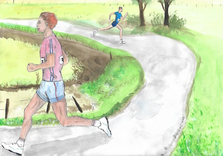 Zijn vader en broers stonden al klaar met hun riek, Marcel pikte meteen aan, met een houten kop en lamme benen, niemand in de familie had belangstelling voor zijn toch wel straf exploot: hij had welgeteld 17 loopkilometers afgelegd op net geen 1 uur tijd, een onvoorstelbare prestatie voor iemand die nooit trainde (tijdverspilling volgens zijn pa) en zelfs niet over aangepaste sportkleren beschikte, enkel zijn zondagse drankpak.